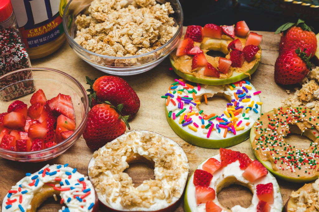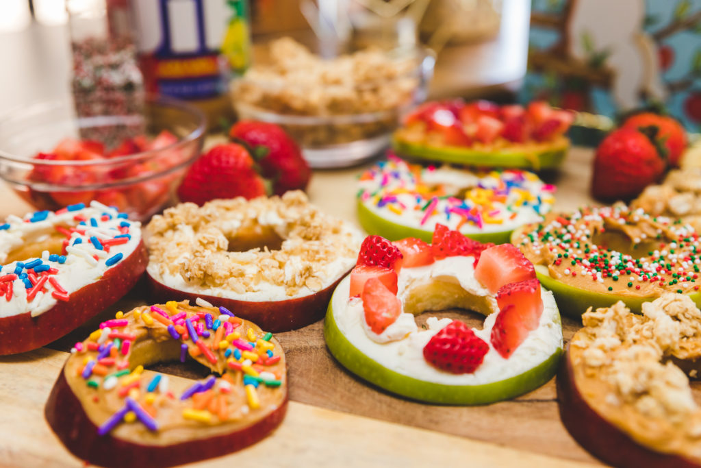 - Top the apple rings with the “frosting” of your choice. Pipe then spread carefully with a popsicle stick or spoon. Garnish each with a variety of the toppings.